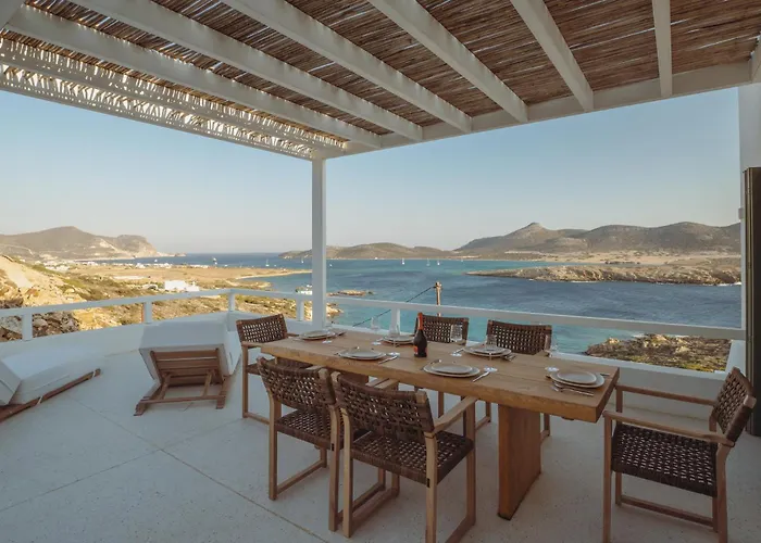 Die 4-Zimmer- Skinos House Antiparos - Private Pool Villa Agios Georgios befindet sich ungefähr 3 km von der Tropfsteinhöhle von Antiparos entfernt und verfügt über eine Terrasse.